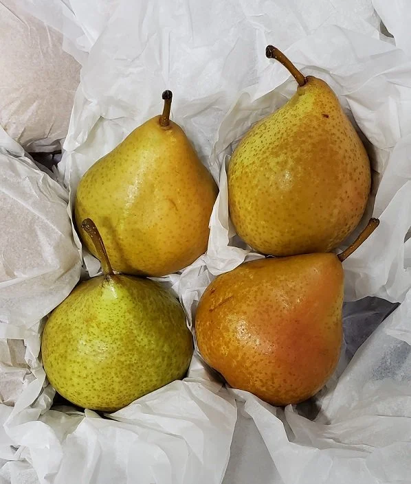 The Durondeau Pear has a golden exterior with streaks of red blush and is covered all over in a soft russet. They are a bit tart with a crisp bite and a floral flavor. Earl thought it was similar to the Winter Nellis pear or honey pear known for its sweet flavor that goes great with cheese platters or in salads. The Durondeau is not a long term storage pear but it is amazing for fresh eating and cooking. The light granular texture is similar to the Bosc Pear which is often used in desserts. The Durondeau ripens similar to the Bosc, which gives less than other pears when you apply gentle pressure at the neck. As a reminder pears ripen from the inside out.