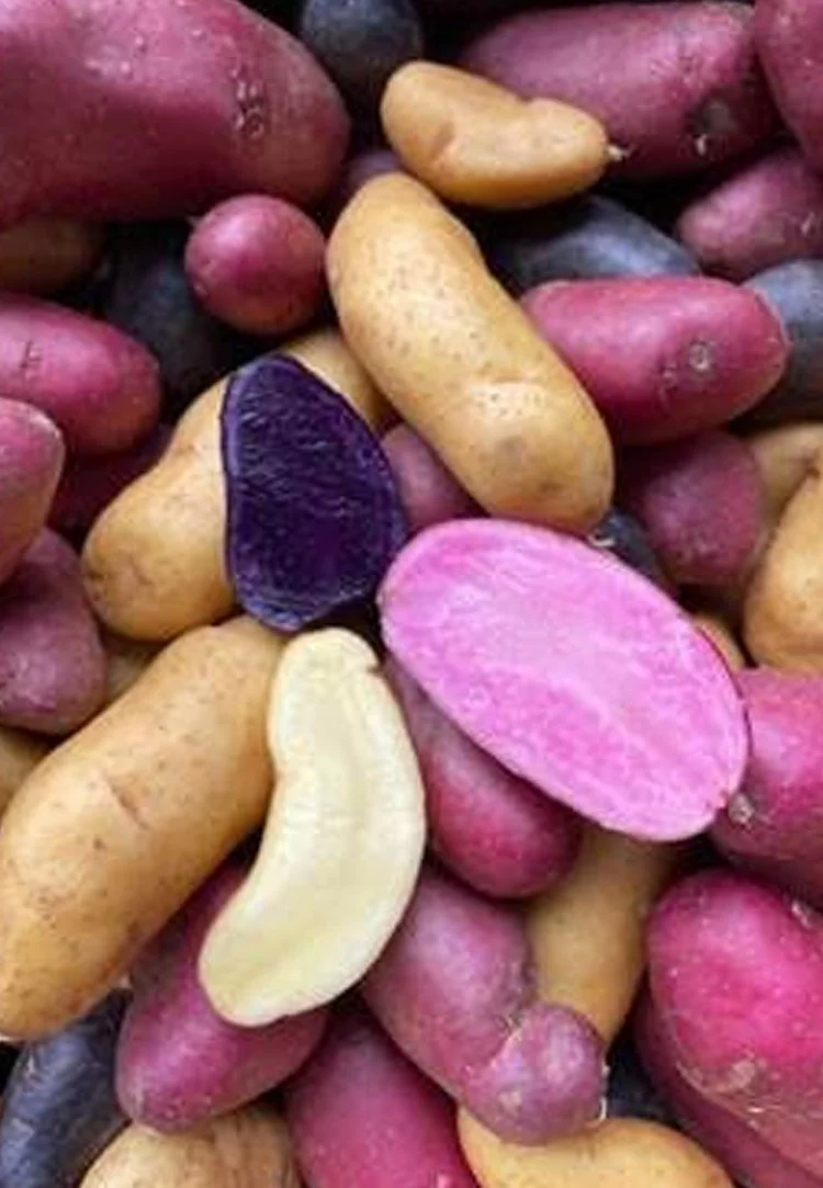 Clean potatoes from Bouchey – susceptible to skinning due to thin skin (which also allows them to be the first on the market!). This can lead to some oxidization, but it’s only a cosmetic issue. Potatoes should have a stronger cure by October.