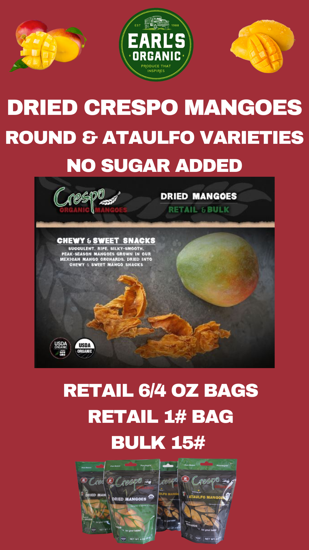 Ask your Earl’s Sales rep for a sample of Crespo’s New Dried Mangos, a super sweet and chewy snack!