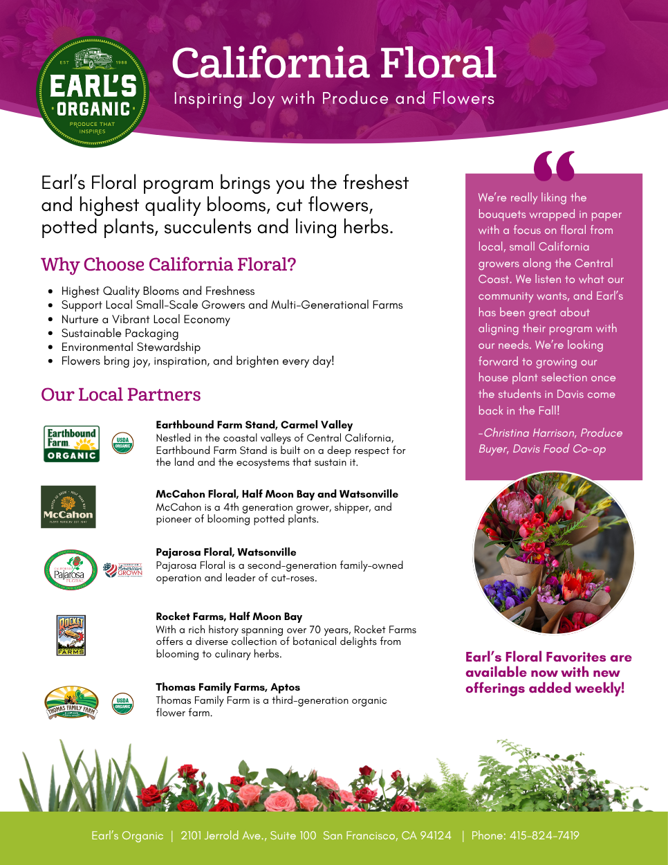 Nestled in the coastal valleys of Central California, Earthbound Farm is built on a deep respect for the land and the ecosystems that sustain it. At the heart of everything we do is a simple belief: “we like to farm with nature,” says grower TJ Silva. This guiding principle is why they grow flowers organically and regeneratively. TJ focuses on building soil health, increasing biodiversity, and working with the rhythms of nature and not against them.